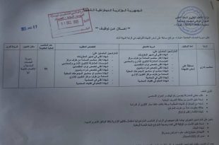 وزارة التربية الوطنية مديرية التربية لولاية الأغواط مصالح التدريس والامتحانات مكتب الامتحانات والتوجيه ads إعـــــلان تعلن مديرية التربية لولاية الأغواط عن فتح مسابقة على أساس الاختبارات للالتحاق بالرتب المبينة في الجدول أدناه: الرتبةعدد المناصبنمط التوظيفشروط التوظيفحقوق المشاركةمهندس دولة في الإعلام الآلي01على أساس الاختباراتمن بين …