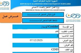 وزارة العمل والتشغيل والضمان الاجتماعي الفرع الولائي للتشغيل تمنراست الملحقة المحلية للتشغيل تمنراست ads عرض عمل المؤسسة: كوسيدار المنصب المطلوب: لحام عدد المناصب: 2 تاريخ العرض: 07/12/2025 نوع العقد: CDD الشروط المطلوبة: العمر من 25 الى 50 سنة الخبرة المطلوبة 03 سنوات او اكثر …