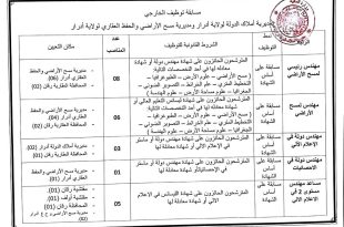 وزارة المالية المديرية العامة لأملاك الدولة ads مسابقة توظيف خارجي لمديرية أملاك الدولة لولاية أدرار ومديرية مسح الأراضي والحفظ العقاري لولاية أدرار الوثائق المطلوبة طلب خطي للمشاركة (يتضمن العنوان الكامل بدقة ورقم الهاتف الشخصي). صورتان (02) شمسيتان. نسخة من بطاقة التعريف الوطنية. شهادة الاقامة …