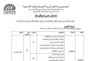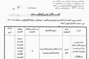 وزارة التعليم العالي والبحث العلمي الديوان الوطني للخدمات الجامعية مديرية الخدمات الجامعية وهران بير الجير ads حرر بوهران في: 22 ديسمبر 2025 إعلان عن توظيف تعلن مديرية الخدمات الجامعية وهران بير الجير، عن فتح مسابقة للتوظيف بعنوان سنة 2025 في منصب الشغل المبين أدناه: …