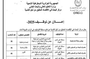وزارة التعليم العالي والبحث العلمي مركز البحث في الاقتصاد المطبق من أجل التنمية CREAD ads إعــــلان عن تـوظـيـف -2025- يعلن مركز البحث في الاقتصاد المطبق من أجل التنمية عن فتح مسابقة التوظيف في الرتب المبينة أدناه: الرتبةنمط التوظيفشروط الالتحاقالتخصص المطلوبعدد المناصبمهندس دولة لدعم البحثمسابقة …