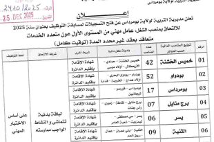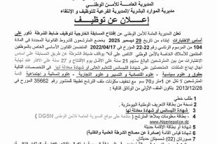 وزارة الداخلية والجماعات المحلية والتهيئة العمرانية المديرية العامة للأمن الوطني مديرية الموارد البشرية / المديرية الفرعية للتوظيف والانتقاء ads إعــــلان عن تـوظـيـف تعلن المديرية العامة للأمن الوطني عن افتتاح المسابقة الخارجية لتوظيف ضباط الشرطة ذكور على أساس الاختبارات إبتداء من تاريخ 29 ديسمبر 2025 …