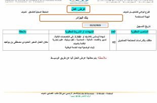 وزارة العمل والتشغيل والضمان الاجتماعي الوكالة الوطنية للتشغيل الملحقة المحلية للتشغيل بالنعامة ads عرض عمل المؤسسة: بنك الفلاحة والتنمية الريفية بالنعامة BADR تاريخ التسجيل: 2025/12/25 حالة العرض: فعال امتداد عرض العمل: محلي 1. منصب: مكلف بالزبائن عدد المناصب: 01 شروط المنصب: شهادة ليسانس علوم …