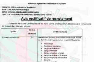 وزارة التعليم العالي والبحث العلمي الديوان الوطني للخدمات الجامعية مديرية الخدمات الجامعية سيدي بلعباس وسط ads إعلان توظيف تعلن مديرية الخدمات الجامعية سيدي بلعباس وسط، عن فتح المسابقات للتوظيف على أساس الاختبارات في الرتب التالية: الرتبةعدد المناصبشروط الالتحاقمنشط جامعي01المترشحون الحائزون على شهادة ليسانس في …