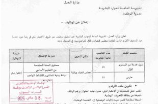 وزارة العدل المديرية العامة للموارد البشرية مديرية الموظفين ads إعلان عن توظيف تعلن وزارة العدل، المديرية العامة للموارد البشرية عن تنظيم توظيف عن طريق الاختبار المهني في رتبة عون خدمة من المستوى الأول وحارس لفائدة مجلس قضاء ورقلة، كما هو مبين في الجدول أدناه: …