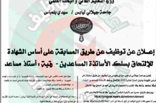 وزارة التعليم العالي والبحث العلمي جامعة سطيف 1 – فرحات عباس مديرية الجامعة الأمانة العامة ads إعلان توظيف تعلن جامعة سطيف 1- فرحات عباس عن فتح التوظيف و/أو المسابقة على أساس الشهادة، بعنوان سنة 2025 (المناصب المالية الإضافية) للالتحاق بسلك الأساتذة المساعدين، رتبة أستاذ …