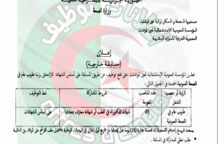 وزارة الصحة مديرية الصحة والسكان لولاية الجزائر المؤسسة الاستشفائية المتخصصة في الحروق الكبرى الدكتور -سعيد شيبان- بزرالدة ads إعلان عن توظيف تعلن المؤسسة الاستشفائية المتخصصة في الحروق الكبرى د. سعيد شيبان – زرالدة – عن فتح مسابقات على أساس الشهادات في الرتب المبينة أدناه: …