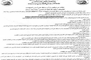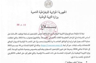 وزارة التربية الوطنية ads بــــــــــــــــلاغ 08 جانفي 2026 تبعًا لما عاينته مصالح وزارة التربية الوطنية من انشغالات تخص المترشحين لمسابقة توظيف الأساتذة على أساس الشهادات في المراحل التعليمية الثلاث (الابتدائي، المتوسط، والثانوي) بعنوان سنة 2025، والتي انطلقت عملية التسجيل فيها وإيداع الوثائق الخاصة بها …