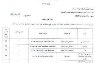 وزارة الصحة مديرية الصحة والسكان لولاية قالمة المؤسسة العمومية الاستشفائية الحكيم عقبي ads قالمة في: 06 جانفي 2026 إعلان عن توظيف تعلن إدارة المؤسسة العمومية الاستشفائية الحكيم عقبي قالمة عن فتح توظيف مباشر على أساس الشهادة لرتبة مساعدي التمريض للصحة العمومية خريجي المدارس الخاصة …
