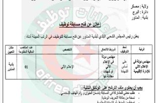 ولاية: الشلـف دائرة: عين مران بلدية: عين مران ads إعلان عن توظيف خارجي يعلن رئيس المجلس الشعبي البلدي لبلدية عين مران عن فتح مسابقة توظيف على أساس الاختبارات للالتحاق بالرتب المبينة في الجدول أدناه: الرتبةعدد المناصبشروط التوظيفعون رئيسي للإدارة الإقليمية01شهادة بكالوريا التعليم الثانوي أو …