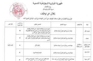وزارة الإتصال مديرية الإدارة والوسائل ads إعلان عن توظيف تعلن وزارة الإتصال عن تنظيم مسابقات للتوظيف على أساس الشهادات في الرتب المبينة في الجدول أدناه: الرتبةنمط التوظيفشروط الالتحاقالتخصص المطلوبعدد المناصب المالية المفتوحةمكان التعيينمتصرف محللمسابقة على أساس الشهادةشهادة ماستر في التعليم العالي أو شهادة معادلة …
