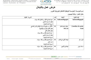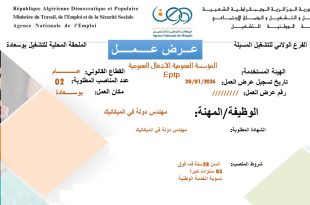 وزارة العمل والتشغيل والضمان الاجتماعي الوكالة الوطنية للتشغيل الفرع الولائي للتشغيل: باتنة الملحقة المحلية للتشغيل: باتنة ads عرض عمل الهيئة المستخدمة: ADE UNITE DE PROD KOUDIET MEDDOUAR القطاع القانوني: PUBLIC تاريخ التسجيل: 19/01/2026 عدد المناصب: 1 المهنة المطلوبة: Ingénieur chimiste en industrie مكان العمل: …