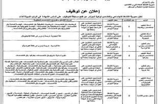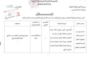 وزارة التربية الوطنية مديرية التربية لولاية الطارف مصلحة المستخدمين ads إعـــــــــلان الطارف في: 21 JAN 2026 تعلن مديرية التربية لولاية الطارف عن فتح عملية توظيف على أساس الاختبار للالتحاق بمناصب الشغل التالية: المؤسسة العمومية الجزائرية للمياه توظف في التخصص التالي: إعلان عن مسابقة توظيف …