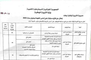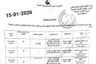 وزارة التربية الوطنية مديرية التربية لولاية جانت ads 18 جانفي 2026 إعلان عن فتح مسابقة على أساس الشهادة بعنوان سنة 2025 تعلن مديرية التربية لولاية جانت عن فتح مسابقة للتوظيف على أساس الشهادة للالتحاق بالرتب المدونة أدناه: الرتبةنمط التوظيفشروط الالتحاقالتخصص المطلوبعدد المناصب المالية المفتوحةمكان …