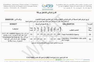 وزارة العمل والتشغيل والضمان الاجتماعي الوكالة الوطنية للتشغيل ads الفرع الولائي للتشغيل بورقلة توزيع عروض العمل المسجلة لدى الفرع الولائي للتشغيل بورقلة على الملاحق المحلية للتشغيل يتم معالجة وإعداد القوائم الاسمية للمترشحين الخاصة بهذا العرض على مستوى الملاحق المحلية ورقلة في: 2026/01/20 المؤسسةHALLIBURTONرقم التسجيل …