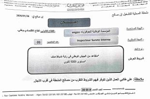 وزارة العمل والتشغيل والضمان الاجتماعي الوكالة الوطنية للتشغيل ملحقة المحلية للتشغيل إن صالح ads إن صالح في: 2026/01/26 إعلان الهيئة المستخدمة: المؤسسة الوطنية للجيوفيزياء engeo القطاع القانوني: قطاع الاقتصادي-وطني- المهنة المطلوبة: Inspecteur Surete Interne عدد المناصب: 01 شروط العرض متقاعد من الجيش الوطني في …