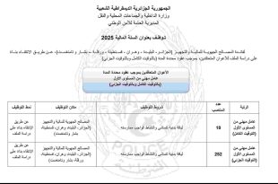 وزارة الداخلية والجماعات المحلية والتهيئة العمرانية المديرية العامة للأمن الوطني توظيف بعنوان السنة المالية 2025 ads لفائدة المصالح الجهوية للمالية والتجهيز (الجزائر – البليدة – وهران – قسنطينة – ورقلة – بشار و تمنغست)، عن طريق الانتقاء بناءً على دراسة الملف للأعوان المتعاقدين، بموجب …