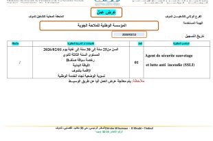 وزارة العمل والتشغيل والضمان الاجتماعي الوكالة الوطنية للتشغيل الفرع الولائي للتشغيل تندوف الملحقة المحلية للتشغيل تندوف ads عرض عمل الهيئة المستخدمة: المؤسسة الوطنية للملاحة الجوية تاريخ التسجيل: 2026/02/12 المناصب المطلوبةالعددالشهادات أو الشروط المطلوبةملاحظةAgent de sécurité sauvetage et lutte anti incendie (SSLI)01* السن من 25 …