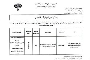 وزارة التعليم العالي والبحث العلمي جامعة جيلالي اليابس – سيدي بلعباس مديرية الجامعة / الأمانة العامة المديرية الفرعية للمستخدمين والتكوين ads إعلان عن توظيف خارجي تعلن جامعة جيلالي اليابس سيدي بلعباس عن فتح توظيف على أساس الشهادة وعلىاساس الإختيار للإلتحاق بالرتب المشار إليها في …