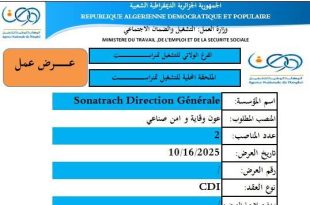 وزارة العمل والتشغيل والضمان الا=جتماعي الوكالة الوطنية للتشغيل ads عرض عمل شركة سوناطراك تعلن عن عروض عمل على مستوى مختلف الملاحق المحلية للتشغيل كالتالي: الولايات المعنية: توقرت إيليزي جانت إعلان عن توظيف بالمجلس الأعلى للشباب: الجزائر العاصمة، البليدة، تيبازة، بومرداس. إعلان توظيف في مديرية …