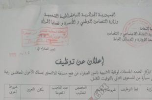اعلان عن توظيف اعلانات توظيف بالولايات التالية بومرداس، البليدة، برج بوعريريج، النعامة الجلفة التفاصيل كاملة مرفقة ادناه ads بلدية الثنية بومرداس يعلن رئيس المجلس الشعبي البلدي لبلدية الثنية بومرداس عن فتح مسابقة توظيف على اساس الشهادة في الرتب المبينة ادناه عون للادارة الاقليمية بلدية …