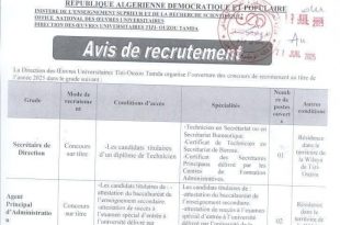وزارة التعليم العالي والبحث العلمي مديرية الخدمات الجامعية ولاية تيزي وزو ads إعلان توظيف تعلن مديرية الخدمات الجامعية تيزي وزو تامدا عن فتح مسابقات توظيف على اساس الشهادة بعنوان سنة 2025. مديرية التربية تفتح مسابقة توظيف العمال المهنيين 180 منصب سوناطراك توظف في التخصصات …