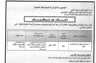 وزارة التعليم العالي والبحث العلمي المديرية العامة للبحث العلمي والتطوير التكنولوجي مركز البحث في تكنولوجيات التغذية الزراعية ads اعلان عن توظيف يعلن مركز البحث في تكنولوجيات التغذية الزراعية عن فتح توظيف بعنوان السنة المالية 2025 في المنصب التالي: منصب الشغلالمناصب المفتوحةنمط التوظيفشروط التوظيفمكان التعيينعامل …