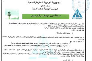 وزارة النقل المؤسسة الوطنية للملاحة الجوية مسابقة تكوين لتوظيف مراقبين جويين ads تنظم المؤسسة الوطنية للملاحة الجوية خلال شهر جويلية 2025 مسابقة جهوية لغرض التوظيف عن طريق التكوين لمراقبي الملاحة الجوية: مدة التكوين: إثنان وعشرون (22) شهرا إبتداءا من سبتمبر 2025؛ مكان التكوين: المدرسة …