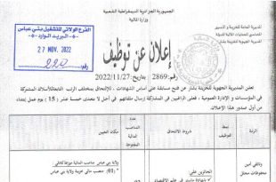 اعلان عن توظيف المديرية الجهوية للخزينة تعلن المديرية الجهوية للخزينة عن فتح مسابقة توظيف على اساس الشهادات وعلى اساس الاختبار المهني بالولايات التالية برج باجي مختار بني عباس تيميمون في الرتب المبينة ادناه مفتش رئيسي للخزينة والمحاسبة والتأمينات 47 مفتش للخزينة والمحاسبة والتأمينات 06 عون معاينة …