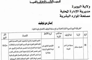 المديرية الإدارية المحلية مصلحة الموارد البشرية ولاية البويرة ads إعلان عن توظيف تعلن ولاية البويرة (المديرية الإدارية المحلية) عن فتح مسابقة للتوظيف للالتحاق بالرتبة التالية: الرقمالرتبةعدد المناصب المفتوحةشروط الالتحاقالتخصصاتمكان التعيين01متصرف مستشار01المترشحون الحائزون على شهادة الماستر أو شهادة معادلة لها– العلوم القانونية والإدارية أو الحقوق، …
