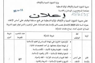 وزارة الشؤون الدينية والأوقاف مديرية الشؤون الدينية والأوقاف لولاية قسنطينة مصلحة المستخدمين والوسائل والمحاسبة ads 09 جويلية 2025 إعلان تعلن مديرية الشؤون الدينية والأوقاف لولاية قسنطينة عن فتح مسابقة توظيف على أساس الإنتقاء بعنوان السنة المالية 2025 للإلتحاق بمنصب قائم بالإمامة بمسجد محمد الفاتح، …