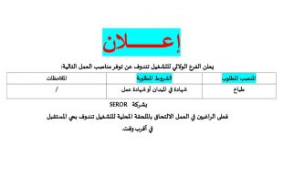 إعلان يعلن الفرع الولائي للتشغيل تندوف عن توفر مناصب العمل التالية: ads المنصب المطلوبالشروط المطلوبةالملاحظاتطباخشهادة في الميدان أو شهادة عمل/ بشركة SEROR فعلى الراغبين في العمل الالتحاق بالملحقة المحلية للتشغيل تندوف بحي المستقبل في أقرب وقت. مديرية التربية تفتح مسابقة توظيف العمال المهنيين 180 …