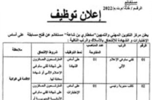 اعلان عن توظيف مركز التكوين المهني والتمهين مخطاري بن شاعة مستغانم ads يعلن مركز التكوين المهني والتمهين مخطاري بن شاعة مستغانم عن فتح مسابقات توظيف على اساس الشهادة وعلى اساس الاختبار في الرتب المبينة ادناه تقني سام في الاعلام الالي عدد المناصب 01 نمط …