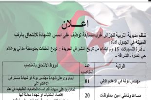 اعلان عن توظيف مديرية التربية الجزائر غرب ads تعلن مديرية التربية الجزائر غرب عن فتح مسابقات توظيف على اساس الشهادة في الرتب المبينة ادناه مهندس دولة في الاعلام الالي عدد المناصب 01 نمط التوظيف مسابقة على اساس الشهادة مساعد وثائقي امين محفوظات عدد المناصب …