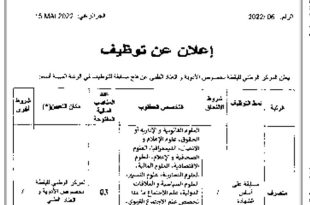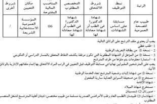 اعلان عن توظيف لمؤسسة العمومية الاستشفائية الشريعة ads تعلن المؤسسة العمومية للصحة الجوارية عشعاشة مستغانم عن فتح توظيف على اساس الشهادة للالتحاق بالرتبة التالية طبيب عام في الصحة العمومية عدد المناصب : 06 نمط التوظيف على اساس الشهادة تاريخ نشر الاعلان 23 ماي 2022 …