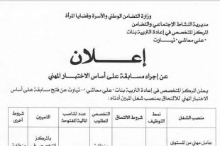 وزارة التضامن الوطني والأسرة وقضايا المرأة مديرية النشاط الإجتماعي والتضامن المركز المتخصص في إعادة التربية بنات علي معاشي – تيارت ads إعلان عن إجراء مسابقة على أساس الاختبار المهني يعلن المركز المتخصص في إعادة التربية “بنات – علي معاشي – تيارت” عن فتح مسابقة …