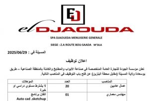 SPA DJAOUEDA MENUISERIE GENERALE SIEGE : Z.A ROUTE BOU-SAADA M’SILA ads المسيلة في : 2025/06/29 إعلان توظيف تعلن مؤسسة الجودة للنجارة العامة المتخصصة في صناعة الأبواب والمطابخ والكائنة بالمنطقة الصناعية – طريق بوسعادة ولاية المسيلة (مقابل محطة البنزين) عن فتح باب التوظيف في المناصب …