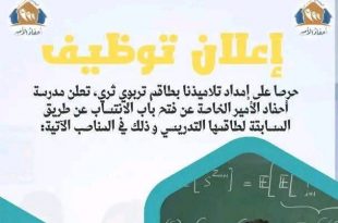 إعلان توظيف ads حرصًا من مدرسة أحفاد الأمير الخاصة على إمداد تلامذتها بطاقم تربوي ثري، تعلن المدرسة عن فتح باب الانتساب عن طريق المسابقة لطاقمها التدريسي وذلك في المناصب الآتية: شروط الإلتحاق شهادة جامعية في التخصص الخبرة المهنية القرب من مكان العمل المتوسط لغة …