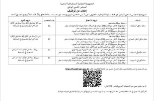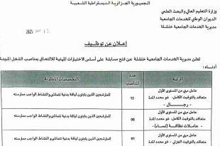 وزارة التعليم العالي والبحث العلمي الديوان الوطني للخدمات الجامعية مديرية الخدمات الجامعية خنشلة ads إعلان عن توظيف تعلن مديرية الخدمات الجامعية خنشلة عن فتح مسابقة على أساس الاختبارات المهنية للالتحاق بمناصب الشغل المبينة أدناه: الرتبةعدد المناصبالتخصصات المطلوبةعامل مهني من المستوى الأول متعاقد بالتوقيت الكامل- …