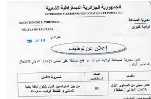 مديرية الصناعة لولاية غليزان ads إعلان عن توظيف تعلن مديرية الصناعة لولاية غليزان عن فتح مسابقة على أساس الإختيار المهني للإلتحاق بالمنصب أدناه: منصبعدد المناصبشروط التأهيلعامل مهني من المستوى الأول بالتوقيت الجزئي (من!tة)01من بين المترشحين الذين يثبتون لياقة بدنية تتماشى والنشاط الواجب ممارسته تكوين …