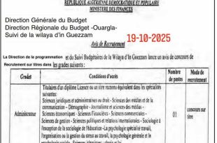 وزارة المالية المديرية العامة للميزانية المديرية الجهوية للميزانية – ورقلة ads إعلان توظيف إن المديرية الفرعية للبرمجة والمتابعة الميزانياتية لولاية عين قزام تعلن عن مسابقة توظيف على أساس الشهادات في الرتبة التالية: Gradesشروط الوصولعدد المناصبنمط التوظيفمتصرف Administrateurحاملو شهادة الليسانس أو شهادة معادلة ومعترف بها …
