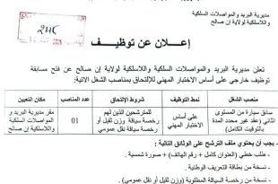 مديرية البريد والمواصلات السلكية واللاسلكية لولاية إن صالح ads إعلان عن تـوظـيـف تعلن مديرية البريد والمواصلات السلكية واللاسلكية لولاية إن صالح عن فتح مسابقة توظيف خارجي على أساس الاختبار المهني للالتحاق بمناصب الشغل التالية: المنصب الشغلنمط التوظيفشروط الالتحاقعدد المناصبمكان التعيينسائق سيارة من المستوى الثاني …