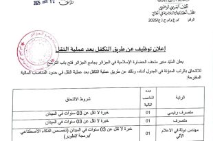 وزارة الشؤون الدينية و الأوقاف المتحف الوطني للآثار والفنون الإسلامية بالجزائر ads الجزائر في: 12 أكتوبر 2025 إعلان توظيف عن طريق التكفل بعد عملية النقل يعلن السيد مدير متحف الحضارة الإسلامية في الجزائر بجامع الجزائر فتح باب الترشح للالتحاق بالرتب المدونة في الجدول أدناه، …
