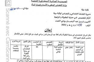 مديرية النشاط الاجتماعي والتضامن لولاية ميلة المركز المتخصص في حماية الطفولة والمراهقة الشهيد قدور عبد الرحمان بوادي النجاء ads إعلان يعلن المركز المتخصص في حماية الطفولة والمراهقة عبد الرحمان قدور بوادي النجاء عن فتح إختيار مهني للإلتحاق بمنصب الشغل المبين أدناه. منصب الشغلنمط التوظيفشروط …