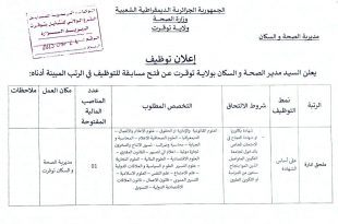 الجمهورية الجزائرية الديمقراطية الشعبية وزارة الصحة مديرية الصحة و السكان ولاية توقرت ads إعلان توظيف يعلن مدير الصحة و السكان بولاية توقرت عن فتح مسابقة للتوظيف في الرتب المبينة أدناه: مديرية التربية تفتح مسابقة توظيف العمال المهنيين 180 منصب سوناطراك توظف في التخصصات الطبية …