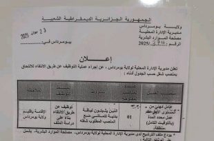 ولاية بومرداس مديرية الإدارة المحلية مصلحة الموارد البشرية ads بومرداس في: 23 جوان 2025 إعــلان تعلن مديرية الإدارة المحلية لولاية بومرداس، عن إجراء عملية التوظيف عن طريق الانتقاء للالتحاق بمنصب شغل حسب الجدول أدناه: منصب الشغلعدد المناصب المفتوحةشروط التوظيفملاحظةعامل مهني من المستوى الأول (عامل …