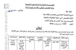 وزارة التضامن الوطني و الأسرة و قضايا المرأة ولاية ميلة مديرية النشاط الاجتماعي و التضامن لولاية ميلة المركز المتخصص في حماية الطفولة والمراهقة ads إعلان يعلن المركز المتخصص في حماية الطفولة والمراهقة عبد الرحمان بوزادي النجاء عن فتح إختيار مهني للإلتحاق بمنصب الشغل المبين …