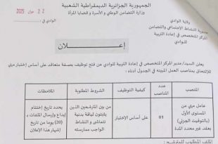 وزارة التضامن الوطني و الأسرة وقضايا المرأة ولاية الوادي مديرية النشاط الاجتماعي والتضامن المركز المتخصص في إعادة التربية الوادي ads إعلان يعلن مدير المركز المتخصص في إعادة التربية بالوادي عن فتح توظيف بصفة متعاقد على أساس إختيار مهني للإلتحاق بالمناصب المبينة في الجدول أدناه: …