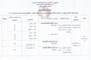 يعلن مدير المركز الجامعي آفلو عن فتح مسابقة توظيف في رتبة أستاذ مساعد قسم (ب) للتخصصات المبينة في الصور أدناه ads استاذ مساعد قسم ب نمط التوظيف : توظيف ومسابقة على اساس الشهادة عدد المناصب 04 تاريخ نشر الاعلان : 27 جويلية 2021 اخر …