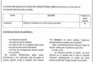 أكمل القراءة »اعلان توظيف بمديرية التجهيزات العمومية لولاية تيبازة